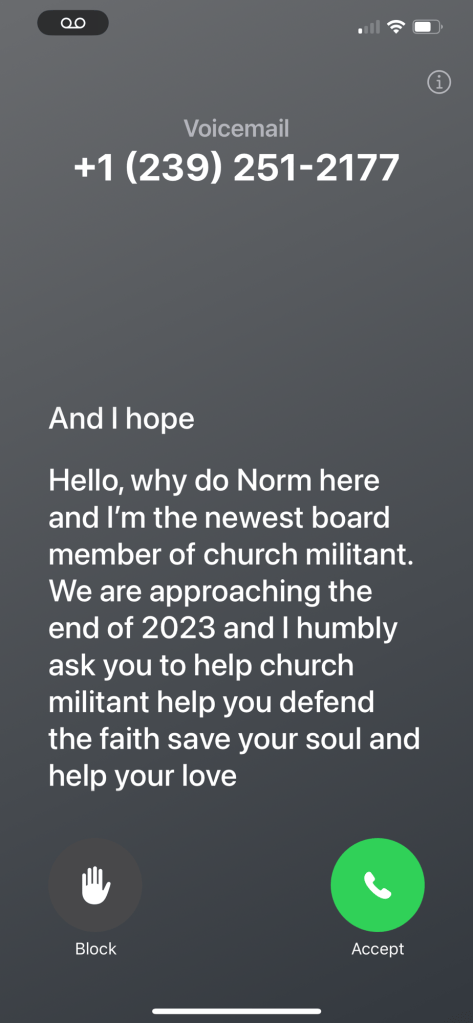 The transcription form Apple isn’t great but you get the point. I have mentioned having been a premium member to CM years ago. We’re talking I cancelled my membership in 2016. Think they’re hurting for cash? My neighbor and fellow parishioner back in Texas got the exact same voicemail around the same time.