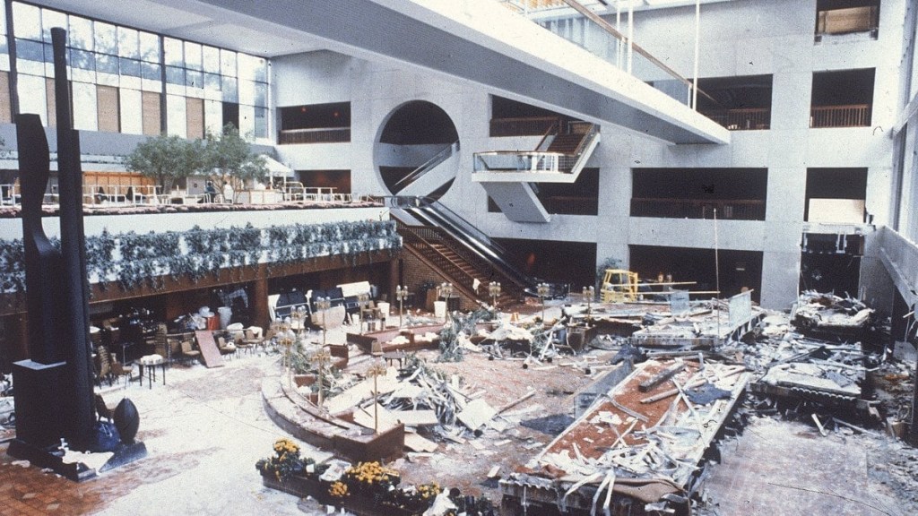 Well, this hotel opened as a Hyatt Regency in 1980. It was magnificent. In particular, the lobby – which featured a four story atrium with “floating” (suspended) catwalks criss-crossing in the air – became a local hotspot. The hotel had begun hosting tea dances on Friday nights in that lobby. These dances, featuring big band music and merriment, attracted hundreds of locals.