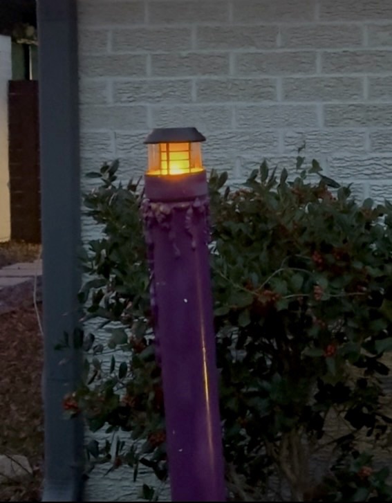 Each candle is simply a 4’ tall piece of 4” diameter PVC pipe. At the top reach pipe rests a PVC coupler in which sits two thing. The first is a wind guard which is nothing more than a two liter plastic bottle cut in half and turned upside down. Inside of the that sits a solar powered landscaping light. I lucked out when I found lights that have a setting for “flicker“. Each pipe is spray painted purple and/or pink. The final touch was to spray on a foaming agent called Great Stuff which is widely available at any Home Depot or Lowes. Spraying around the top of the pipe, th foam slowly drips down and hardens to look like melted candle wax.