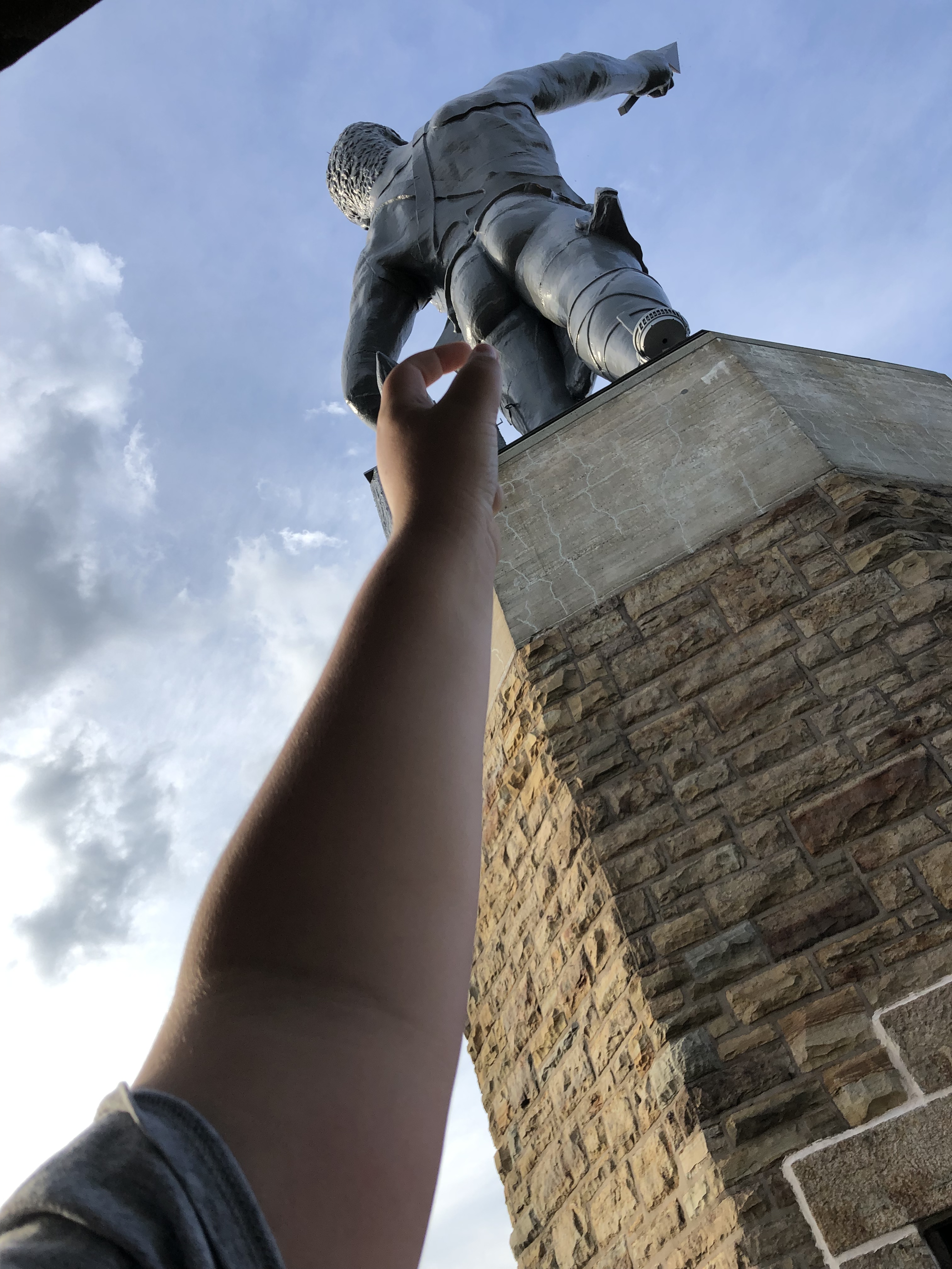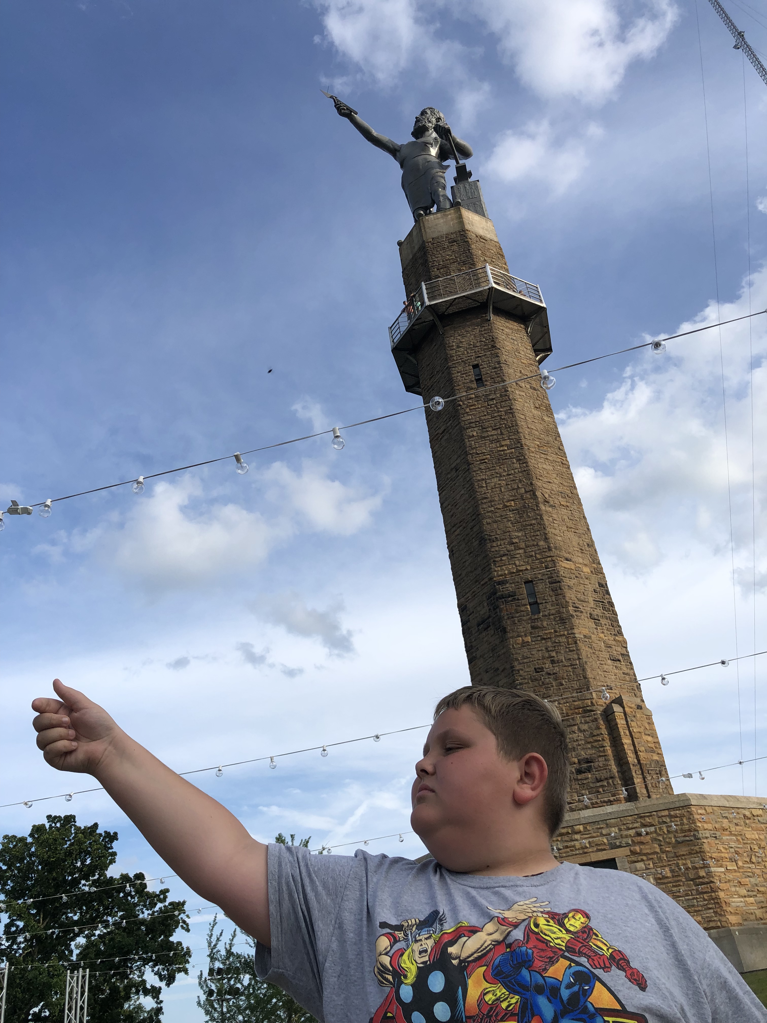 Finally we crossed into Alabama where the stars fell. Not sure if that’s a tourist slogan or if a radiological waste site is actually contributing to the ethereal glow. It is a beautiful place. Here’s where it got really fun for me as a dad. When I was 12 my older brother had just graduated from West Point. Yes, that one. He set out on a trip to Birmingham to visit a friend from the Academy who had left two years earlier and was graduating from Auburn and he took me along for company. I remember the trip well and not just because my brother decided to make the 1000 mile return drive straight through but because our hosts took me to the Statue of Vulcan. Someone from Birmingham once visited New York Harbor and decided the Statue of Liberty would be nice overlooking their city. Instead they got Vulcan. Birminghamanians are proud of their city’s industrial roots so entrenched in the iron industry. In fact they’re known as “the Pittsburgh of the South” even though that city’s lifeblood was steel. Came up with that one all by themselves. Their history of segregation? Not so proud of that one. But they deal with that in several other really neat monuments. Hey, nobody’s perfect. Vulcan is really cool too. Perched on a very tall pedestal resembling a lighthouse, the deity looks out over Birmingham with an anvil at his side and an arrow in his raised hand. He’s even wearing a nifty apron round his waist. Unfortunately that apron was cut for a transparently smaller man. From the rear and shining on the Homewood neighborhood with the brilliance of a large celestial object is the exposed backside of a well-sculpted dude. God? Demi-god? It’s his butt. I remembered all of this and simply had to take my kids for the experience. Both kids laughed heartily when they saw it. Then we went to the top. My daughter even climbed the ten flights of stairs with me (had to get my workout in) and gleefully stepped out onto the viewing platform at the base of the Statue. Before freezing in terror.