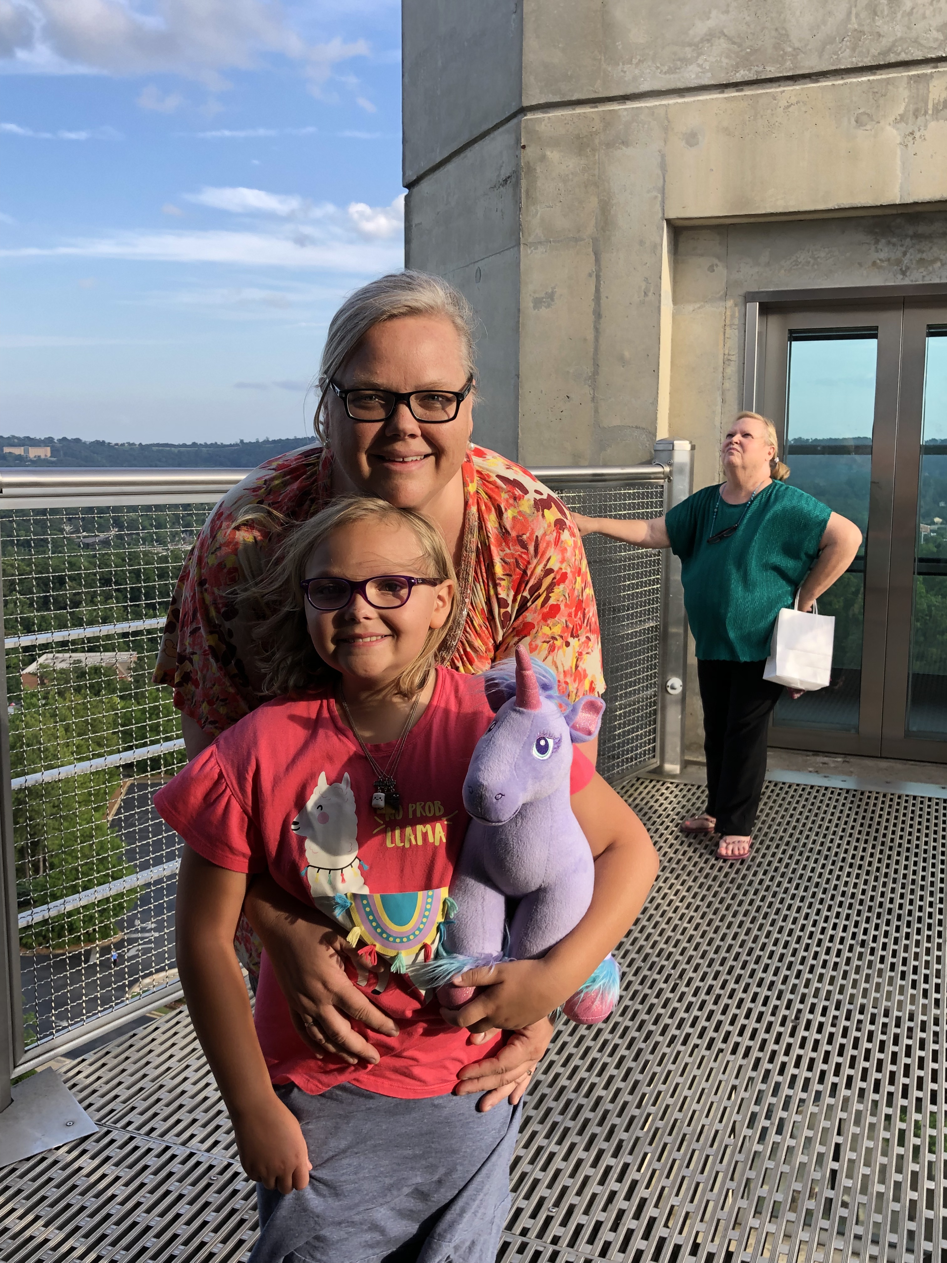 The platform was an open steel grid. Boy was that scary. I had to be brave so she wouldn’t cry. Inside I had three heart attacks. Not figuratively either. Ten stories up and a clear view of the ground below. Maybe this wasn’t such a brilliant plan after all.