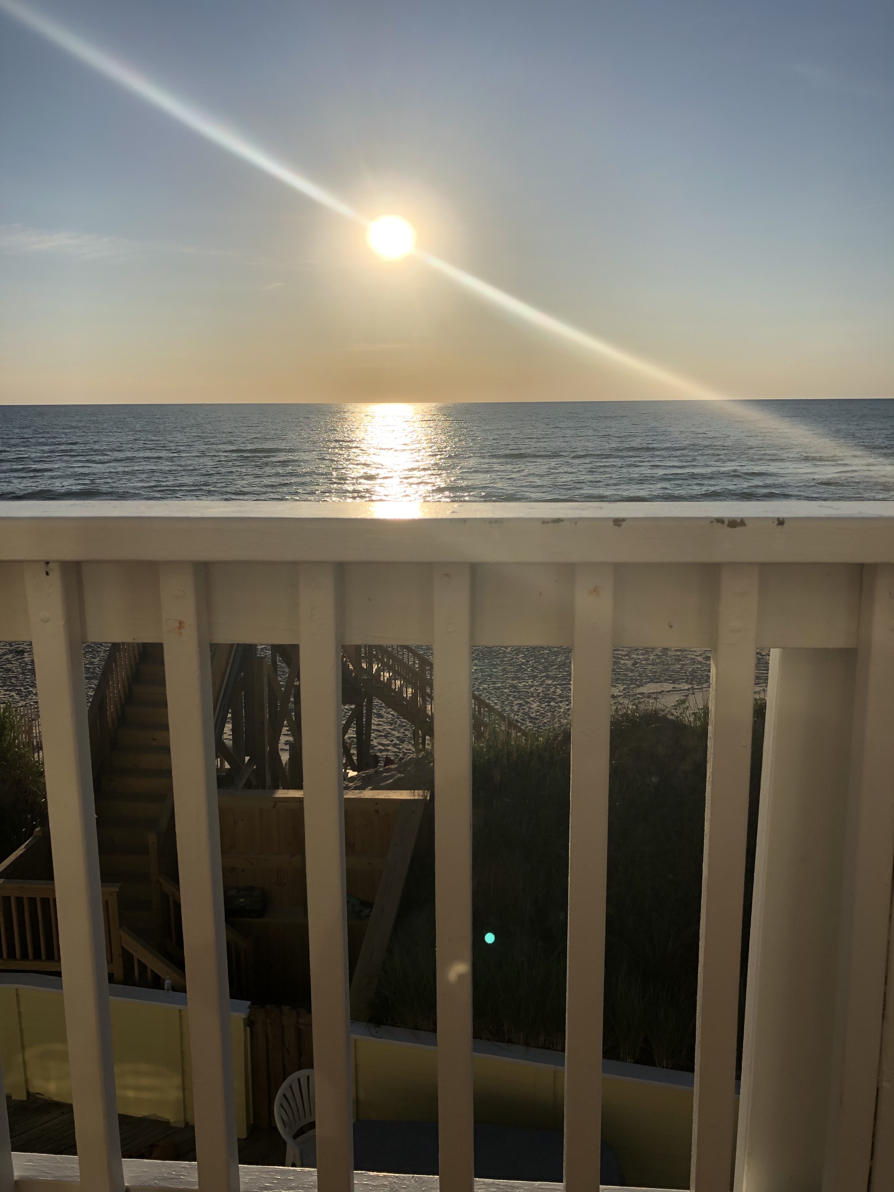 I always have a hard time sleeping on vacation. I don’t know if it’s the change in bed or the change in atmosphere. Something just seems to prevent me getting a good night’s sleep. Today was no exception. I woke up around 5:45 because of the sunlight pouring into the room “like butterscotch” as Joni Mitchell would say. I was excited because at least I would see the sunrise over the Atlantic. Look, it’s not like I go looking for these things but when they happen in my presence I try to make the most of them. I’ve seen the sunrise before but there is something really awe-inspiring watching it come up over the ocean. It truly gives one a sense of the majesty of God. I stepped outside onto the balcony. And I immediately realized that Mr. Golden Sun was already over Mr. Horizon by a few degrees. Damn. I missed it. No worries though. I opened my laptop, went to Youtube, and entered “sunrise ocean corolla nc”. Within moments I was watching what I had just missed – time-lapsed, no less! Saved me the trouble of waiting through the whole boring thing. Then I went upstairs to the kitchen for my black coffee, then downstairs to the driveway to jump rope for a half-hour.