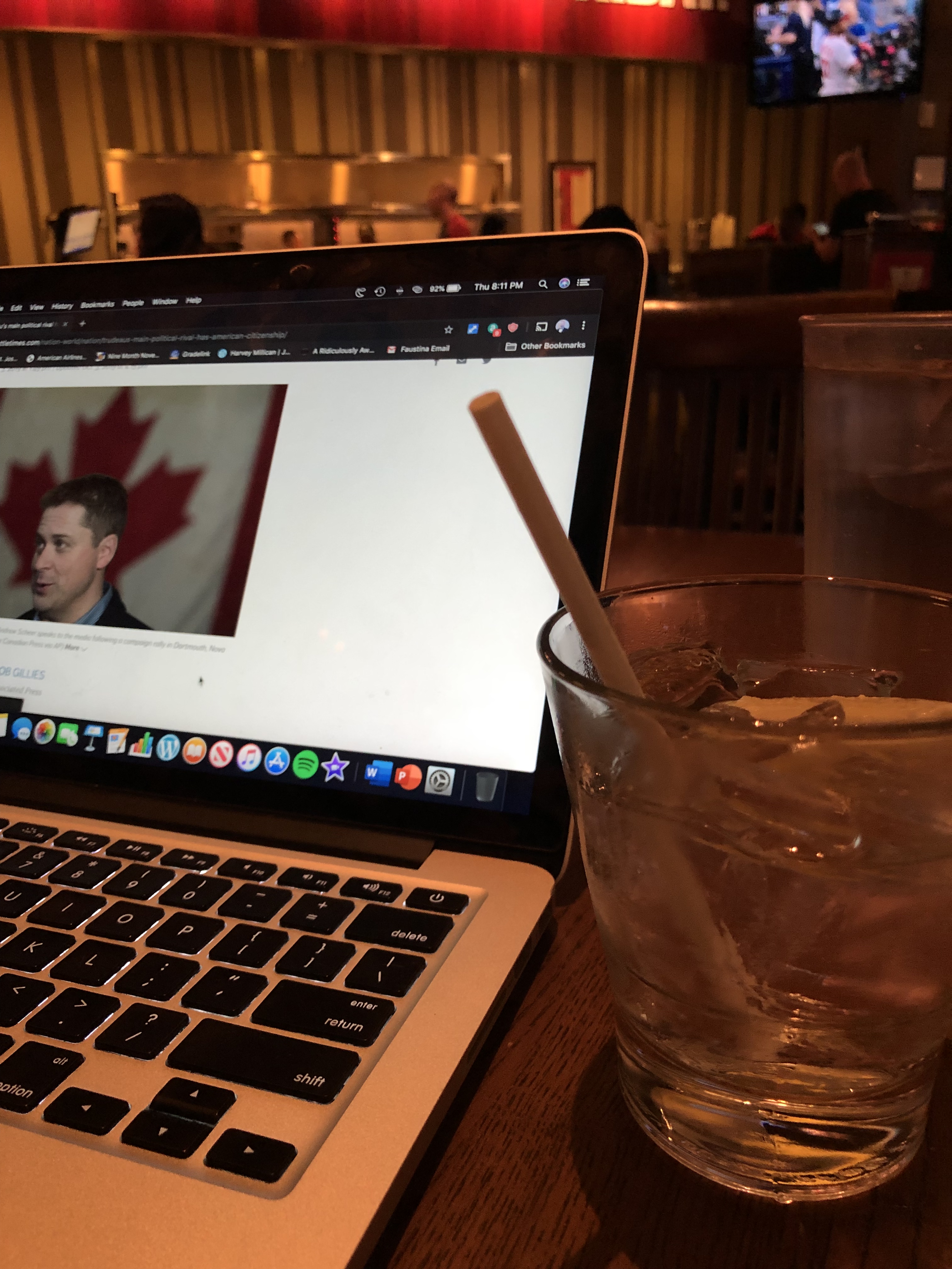 Fortunately I’ve found a happy medium. I’m sitting in an airport bar. This one – the Fridays Express across from my gate – is practically empty tonight. OK, that’s depressing. But, my waiter is super chill. They have gin. And I have a hotspot so I’m reading articles about the Canadian PM election.