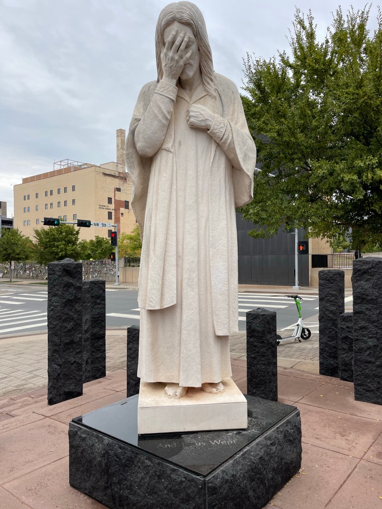 Or it could be, as I would like to believe, that she is inviting us. Blessed Mother is ever to be found standing beside her Son. She is, in a way, our link to Him and in this His most bitter agony and hers, thinking not of her tremendous sorrow but of our need for salvation, she fulfills her role and urges us to take her hand to be united with His.